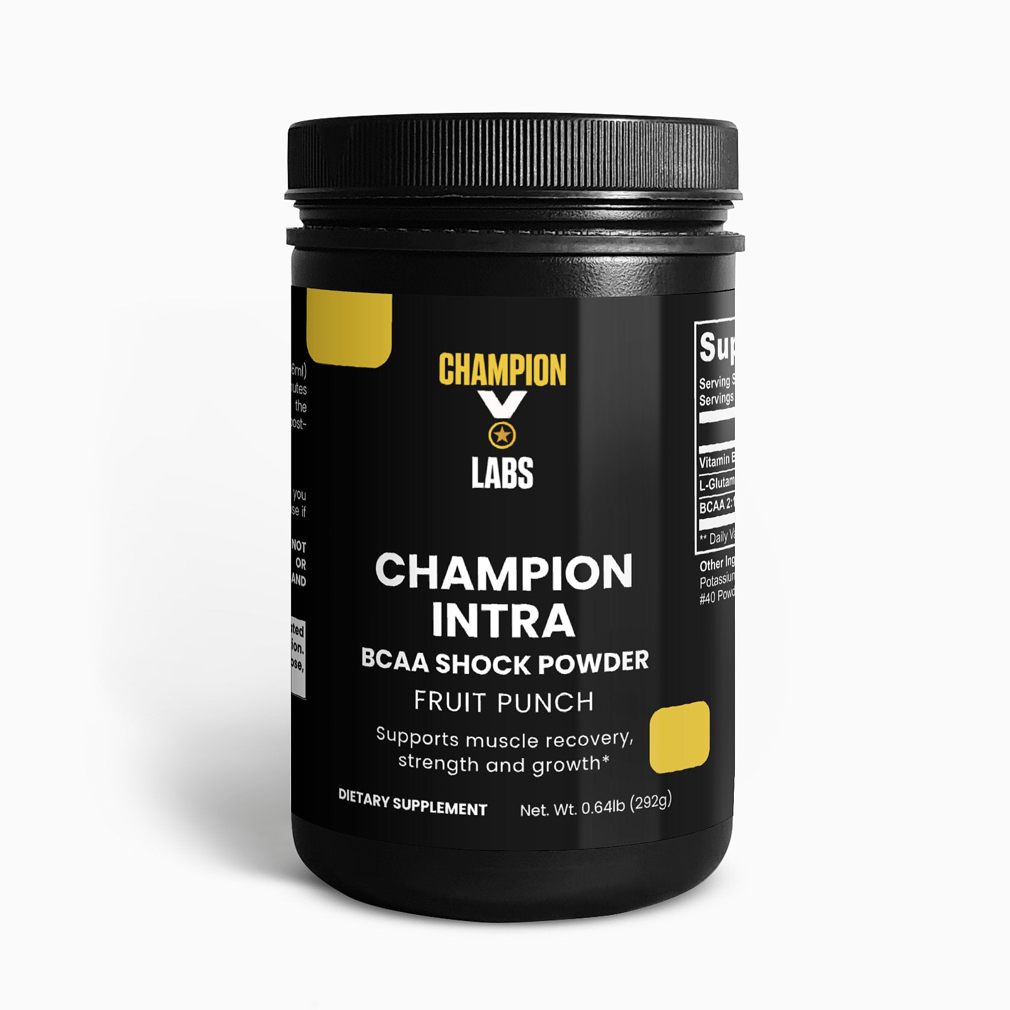Ingredients: Vitamin B6 (as Pyridoxine Hydrochloride), L-Glutamine, BCAA 2:1:1, Citric Acid, Fruit Punch flavor, Potassium Citrate, Silicon Dioxide, Sucralose, Sodium Chloride, Acesulfame Potassium, FD&C Red #40 Powder.
